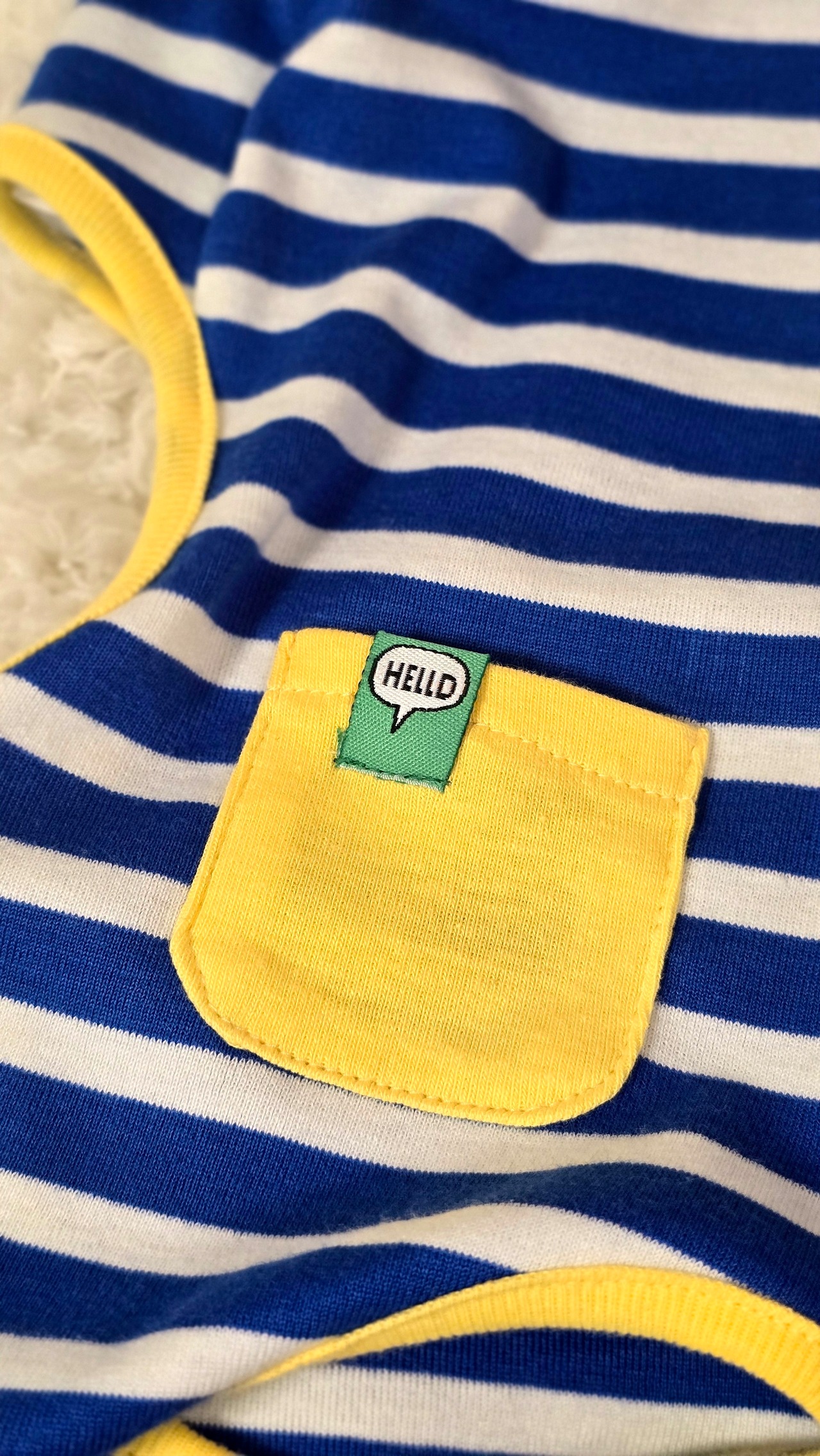 鮮やかなブルーボーダーに、カラフル配色リブを散りばめた、
