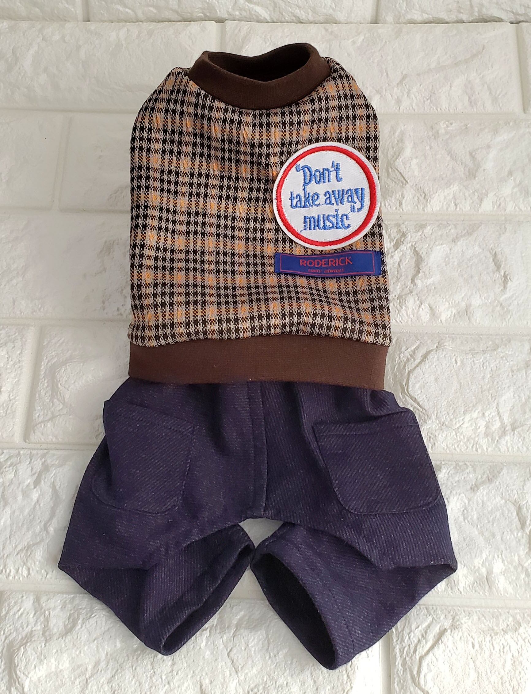 チェックJQのトップスと、まるでデニムみたいなカットソーパンツのブリティッシュ系コーデのオールインワンです。