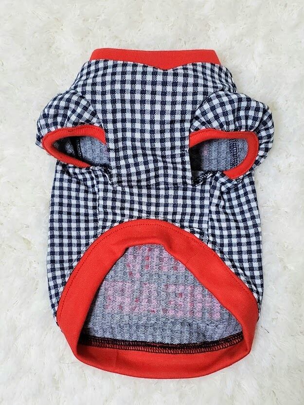 クロに近いネイビーのギンガムには、アカとピンクのグラフィックに赤い配色リブ使いで、