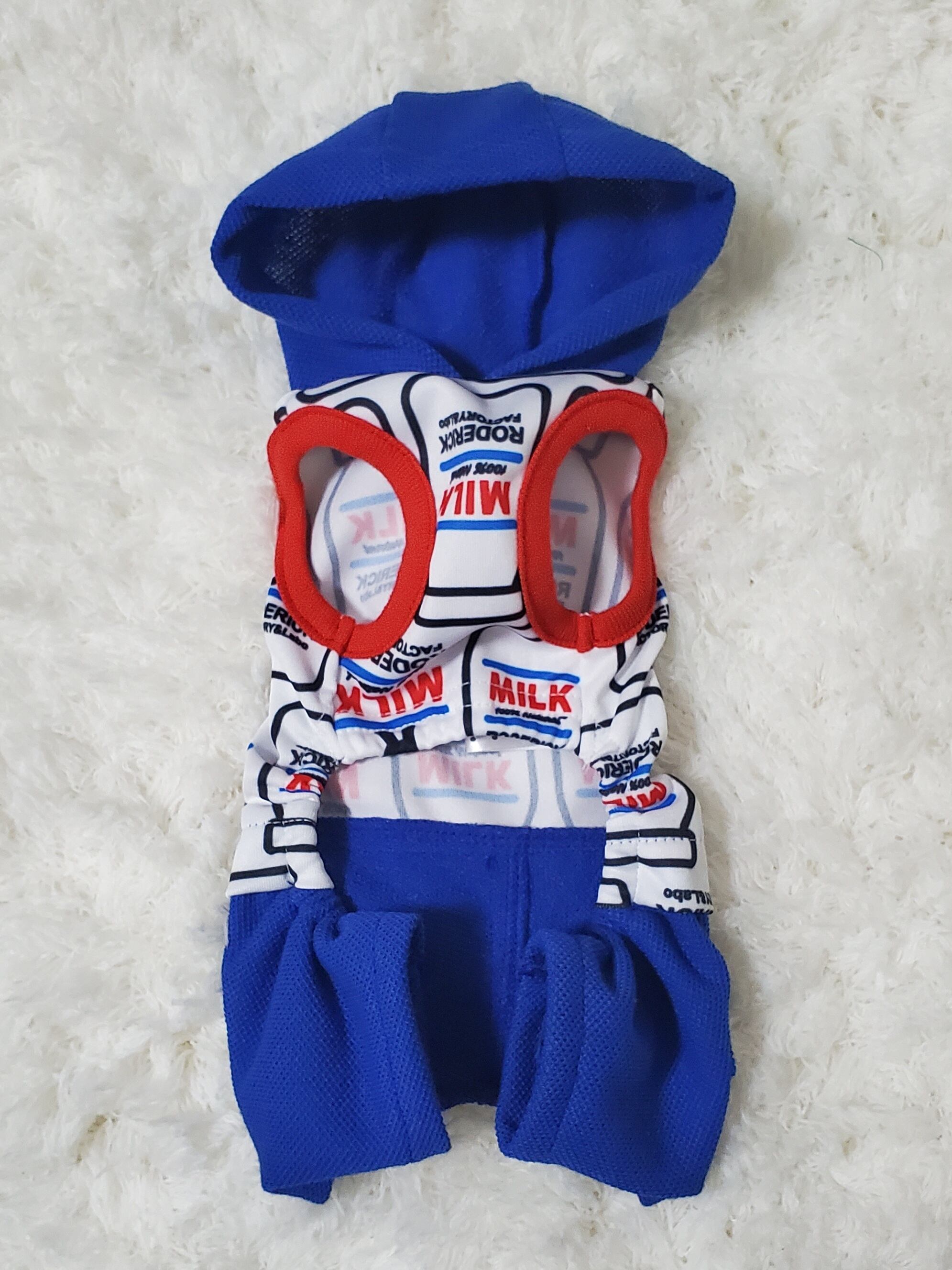 スポーティなポリエステルスムース生地のミルク瓶プリントと、鮮やかなブルーのコーディネイトがPOPな一枚です。