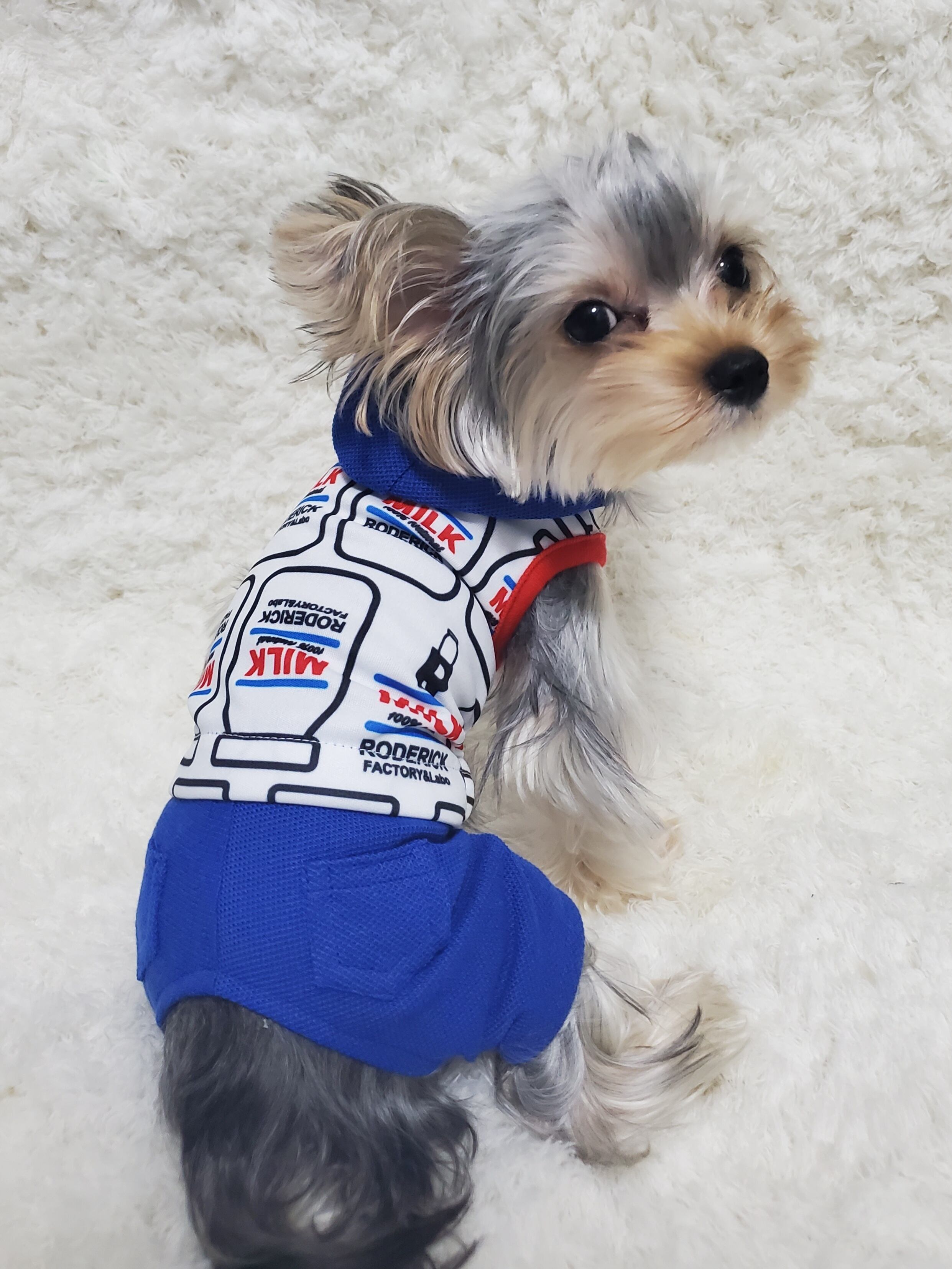 スポーティなポリエステルスムース生地のミルク瓶プリントと、鮮やかなブルーのコーディネイトがPOPな一枚です。